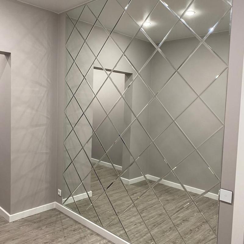 • Зеркальное панно в салоне, Москва, серебряная глянцевая плитка квадратной формы