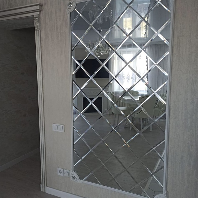 Использовалась серебристая зеркальная плитка формы "вытянутый ромб".